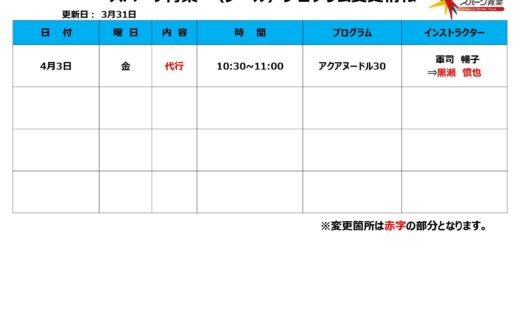 • 【青葉】プールプログラム急な代行のお知らせ(4/1)