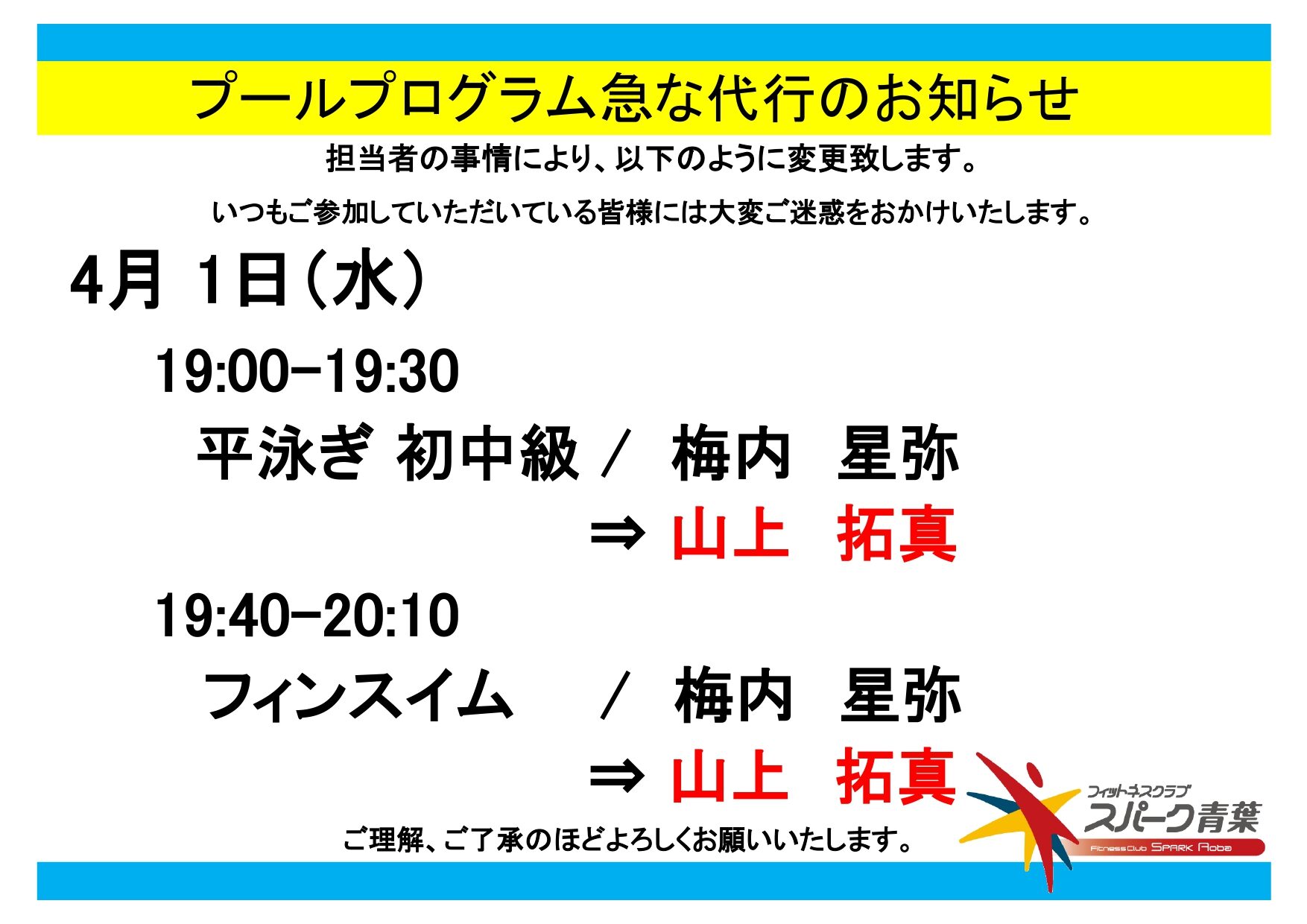 【青葉】プールプログラム急な代行のお知らせ(4/1)