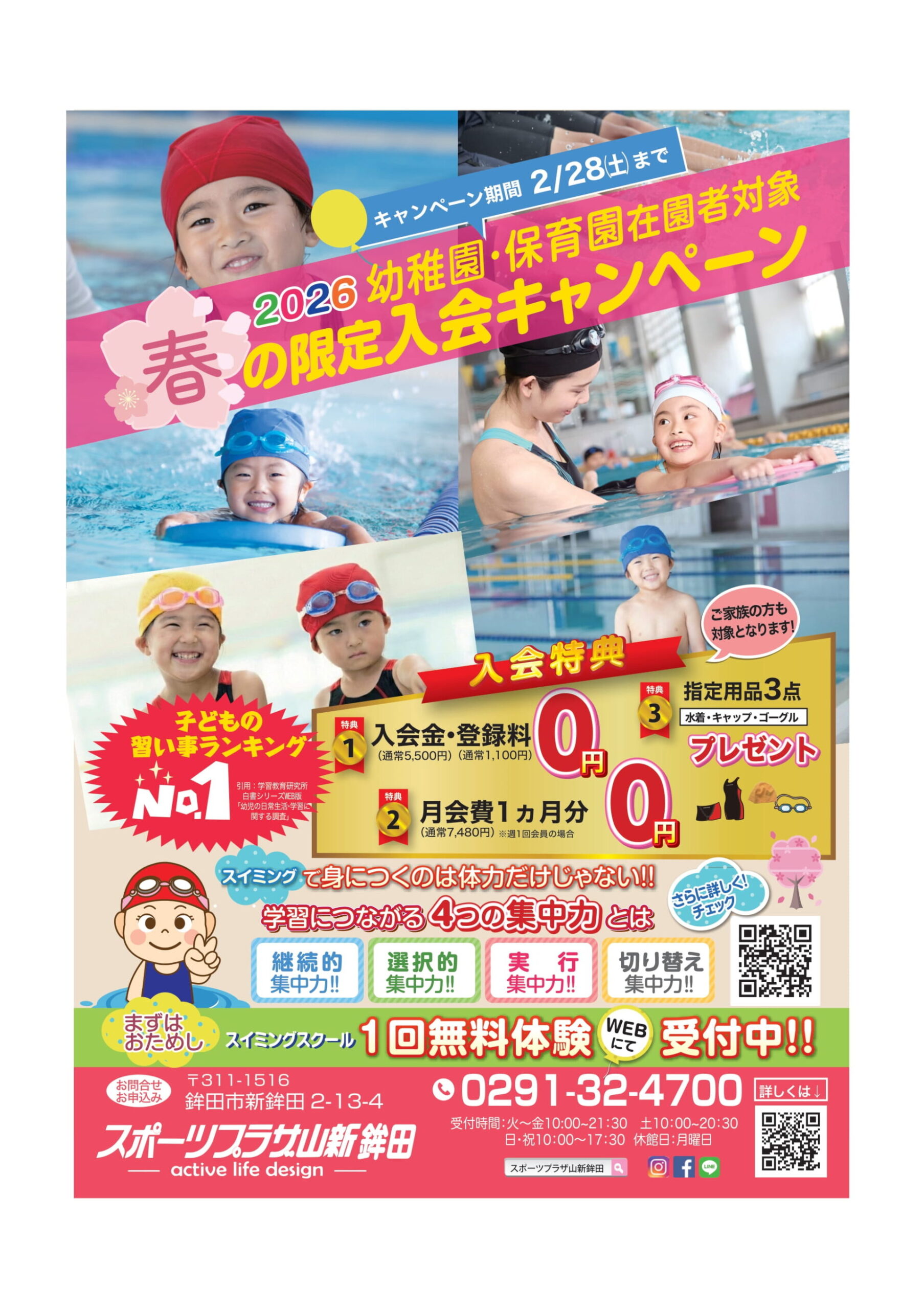 スポーツプラザ山新鉾田では、幼稚園・保育園に在園中のお子さまを対象とした「春の限定入会キャンペーン」を実施中です。