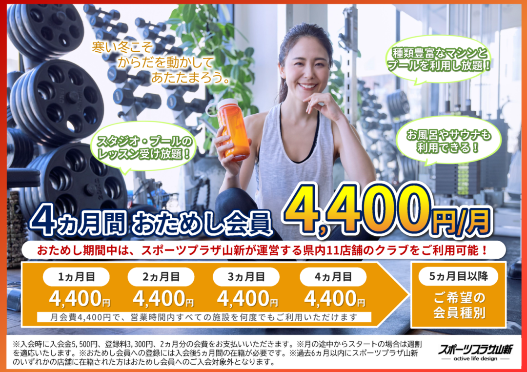 成人フィットネス ジュニアスクール フロント受付時間(火~金) 10:00~20:00 (土) 10:00~18:00 (日・祝) 10:00~17:00 What's New キャンペーン情報 ▪(成人フィットネス)の入会キャンペーン最新情報はこちら ▪(ジュニアスイミングスクール)の入会キャンペーン最新情報はこちら 2026年01月29日 2026 春の限定入会キャンペーン! 幼稚園・保育園に通うお子さま対象! お知らせ 2025年10月01日 (2025年12月分~)「月会費」引き落としシステム変更のご案内 代行情報 2026年02月21日 代行情報 イベント情報 2025年09月27日 スタジオの祭典「INSPIRE FES 2025.11.3」開催決定! 特別プログラム プログラム及びスケジュール 2月プログラムタイムスケジュール 2月スケジュール 周辺地図