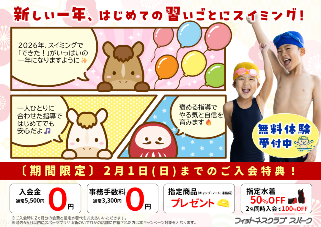 成人フィットネス ジュニアスクール What's New キャンペーン情報 お知らせ 2025年12月27日 キッズダンススクール閉講のお知らせ 2025年10月01日 スパーク鮎川を見学してみませんか? 2025年08月01日 マシンジムエリア混雑状況 2024年10月05日 当クラブへの道案内動画公開中! 2024年04月16日 フィットネスクラブのご利用が初めての方必見!~クラブご利用の流れ~ 代行情報 2025年12月27日 【プール】1/11(日)・1/19(月)変更情報のご案内 2025年12月20日 【スタジオ】12/28(日)~1/11(日)代行、時間変更、休講のご案内 イベント情報 2023年01月31日 有料マンツーマントレーニングのご案内 特別プログラム 2025年12月26日 1/12(月)【成人の日】祝日プログラムのご案内 プログラム及びカレンダー 1月プログラムタイムスケジュール 1月カレンダー 周辺地図