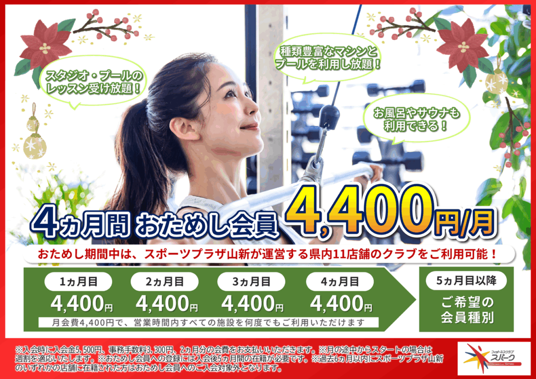 成人フィットネス ジュニアスクール What's New キャンペーン情報 お知らせ 2025年12月03日 年末年始休館日のお知らせ🐎 代行情報 2025年12月11日 12月12日(金) スタジオプログラム急な代行・変更のお知らせ 2025年12月10日 プールプログラム代行・変更のお知らせ ※12/10(水)更新 2025年12月10日 スタジオプログラム代行・変更のお知らせ ※12/10(水)更新 イベント情報 2025年12月08日 冬のサッカースクール体験教室のお知らせ⚽ 特別プログラム プログラム及びカレンダー 12月プログラムタイムスケジュール 12月カレンダー 周辺地図